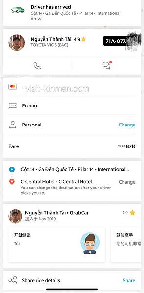 TIP:Grab app 可以在台灣先下載、登錄好資料,但是綁訂信用卡時IP需要在越南境內,或是使用VPN。綁定時使用台灣的門號即可,會收到驗證碼,輸入確認即可使用。建議到機場之後領取SIM卡後輸入信用卡資料(最好不要用機場免費WIFI),再找好欲前往的地址,出航廈之後找定點再叫車,比較好找到司機。另外,機場接送記得告知是國內或國際航廈,以免多走冤枉路。