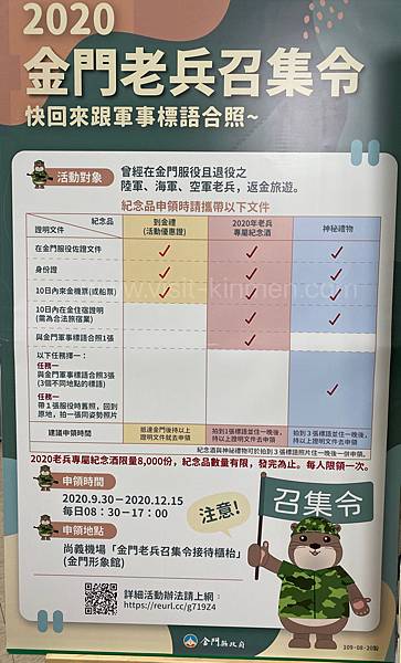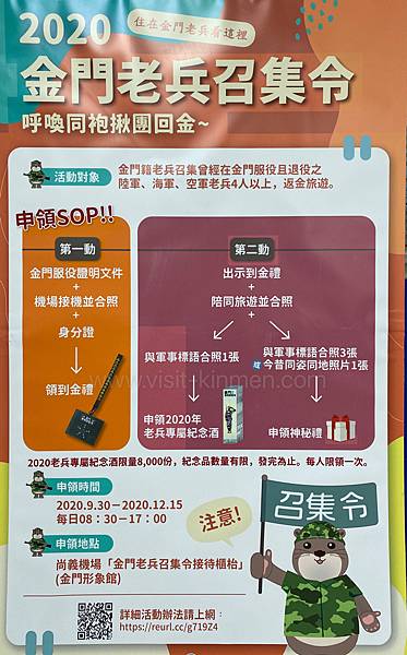 2.陪同旅遊並完成軍事標語合照者,得申領「2020年金門老兵專屬紀念酒」酒券1張後,於活動期間內至金酒公司尚義機場門市兌換專屬酒品。